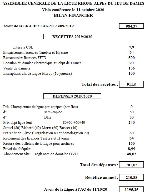 Bilan financier 2019/2020 - AG 2020 Le quitus a été accordé à l’unanimité à Jean-Paul Pellat trésorier.