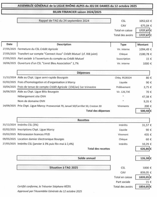 La "Ligue Rhône-Alpes du Jeu de Dames" est une association constituée le 25 septembre 1988, conformément à la loi du 1er juillet 1901. Elle comprend des groupements ou des membres individuels d'amateurs ayant pour but,