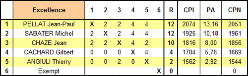 Championnat Drôme-Ardèche 2012 Organisé par Jean-Paul Pellat - Cadence normale - Homologué FFJD Avec deux tours. Tous les 2 représentent une victoire sauf le match Sabater-Chaze ou il y a eu 2 nulles