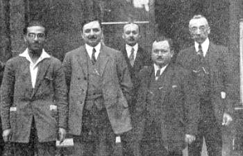 Match Molimard-Fabre, championnat de France, Lyon 9-19 septembre 1923 - De gauche à droite : Bénédictus Springer, Alfred Molimard, Marcel Bonnard, Marius Fabre et L.Delacroix