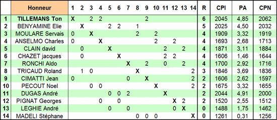 Open 5, 6 et 7 2013/2014 de Villeurbanne Open 5 2013/2014 du 8 février 2014 - Cadence 20mn + 10s Open 6 2013/2014 du 8 mars 2014 - Cadence 20mn + 10s Open 7 2013/2014 du 12 avril 2014 - Cadence 20mn + 10s