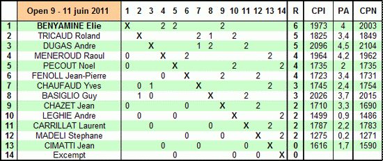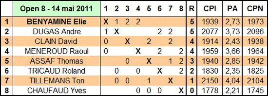 Open 8 et 9 de Villeurbanne Open 8 2010/2011 du 14 mai 2011 - Cadence 20mn + 10s 3 parties système suisse Open 9 2010/2011 du 11 juin 2011 - Cadence 20mn + 10s